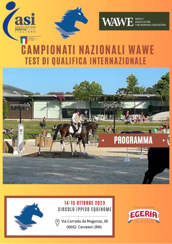 Segnalati Ottobre 14, 2023 @ 8:00 am - Ottobre 15, 2023 @ 5:00 pm CAMPIONATO NAZIONALE EQUITAZIONE DA LAVORO ASI-WAWE (Cerveteri – Roma 14-15 otttobre 2023) CIRCOLO IPPICO EQUIHOME VIA CORRADO DA MAGONZA, 38, CERVETERI, Italia PROGRAMMA CAMPIONATI NAZIONALI WAWE